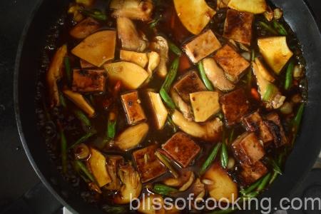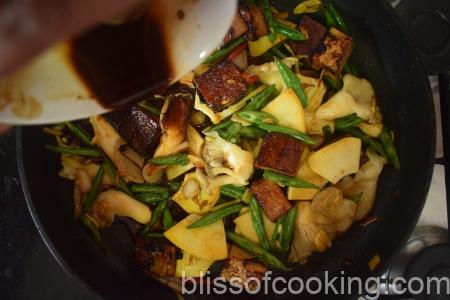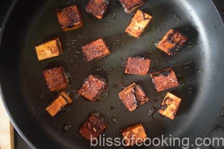 • Pour this on the tofu and toss. Set aside the tofu to marinate for 15 minutes.