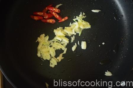 • Add a tablespoon of oil to the wok, add garlic, red chilli and stir-fry until aromatic.