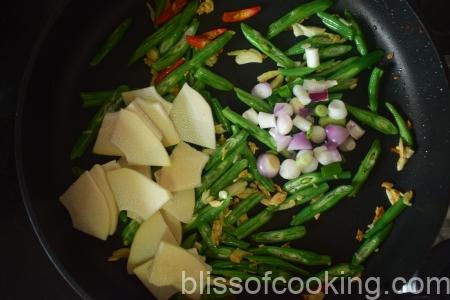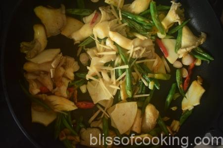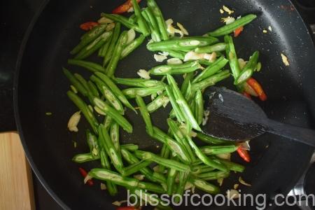 • Add the beans, bamboo shoots, chopped green onions and stir-fry for two minutes.
