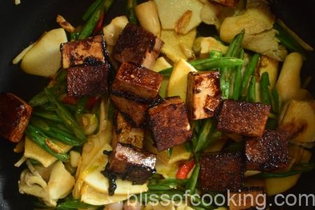 • When the oil is hot, add the bean curd/ tofu cubes and stir-fry until lightly browned. Remove the tofu from the wok and set it aside.
