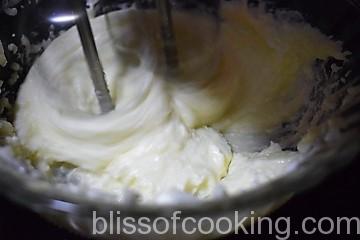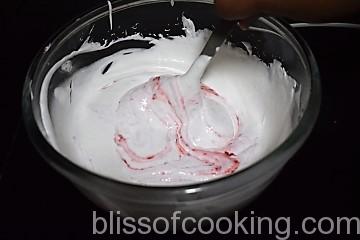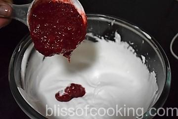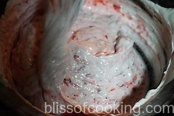 - Whip cream cheese and sugar together till fluffy. Now add ½ the chilled strawberry puree and beat until mixed.