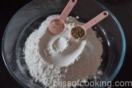• In a bowl add rice flour, jeera, and salt and mix well.