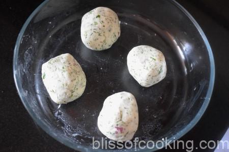• Make a big ball of dough. Smear a bit of oil on the outside of the ball. Cover and rest for 10 minutes.