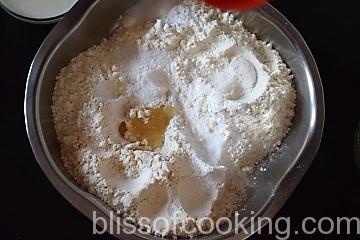 - In a large bowl add maida, atta, baking powder, soda, sugar, salt, half oil, curd and milk.