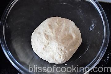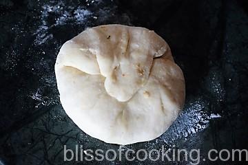 - Once dough has rested for about 5 mins, sprinkle some flour on the working surface and spread the dough to a small round.
