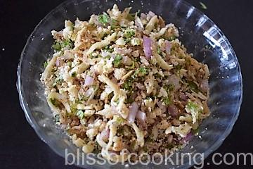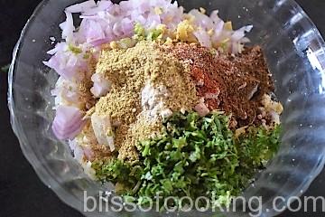 - In a bowl mix all the ingredients mentioned for the stuffing. Check the seasoning and adjust to your taste. Set aside.
