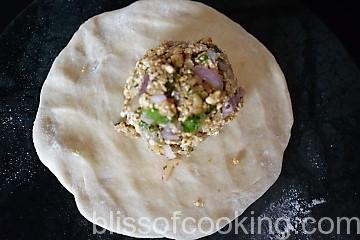 - Now try to spread the stuffed ball by fingers or by using a rolling pin roll to make into 8 inch diameter thick roti.