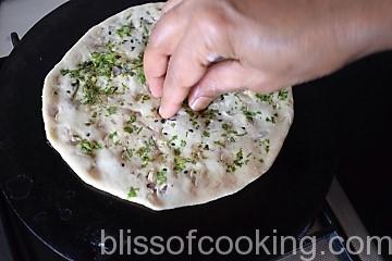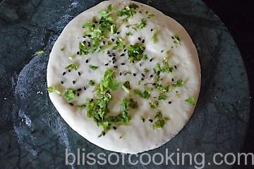 - Apply a little water and sprinkle kalonji and coriander and press a little.