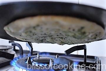 - Once bubble starts to form on the surface of the kulcha, flip the tava / skillet such that the top surface of the kulcha is about 1 inch from the flame and gets directly roasted over the flame until it is roasted well. Keep checking it frequently to avoid burning.