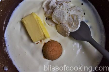 - In a saucepan add cream, butter, sugar, cream removed from Oreo and heat till the sugar has melted and the cream mix is about to boil. Switch off the heat.