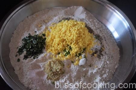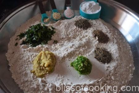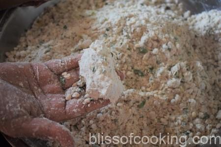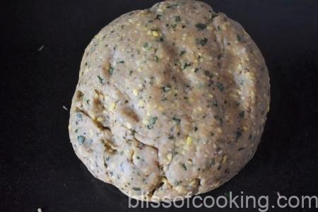 - Add the dal, and oil to the large bowl containing atta, rice flour and all the spices. Mix all the ingredients with your hand for making the dough. The dough should come together when you try to form a ball. If not then add 1 spoon of oil and mix.
