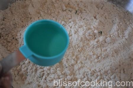 - Add ½ cup water and mix. Make a medium stiff dough by adding more water as required. Knead the dough well, cover and keep to rest for 15 minutes.