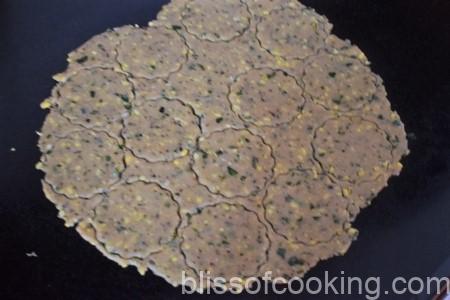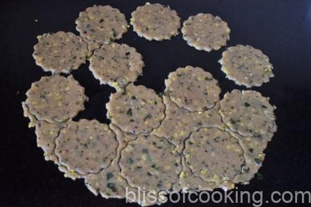 - Knead 1 portion and form a smooth ball. Now roll it into a roti of desired thickness. Cut with a biscuit cutter or a Katori.