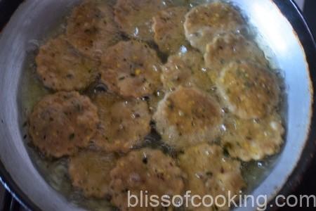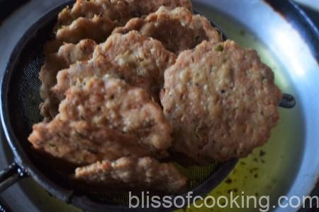 - Heat oil in a broad pan on medium heat, add the mathri’s in batches and fry on low to medium heat till golden and crisp. Drain and store in an airtight container.
