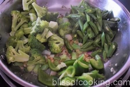 - Now add broccoli, beans, pepper and saute for 3 minutes.