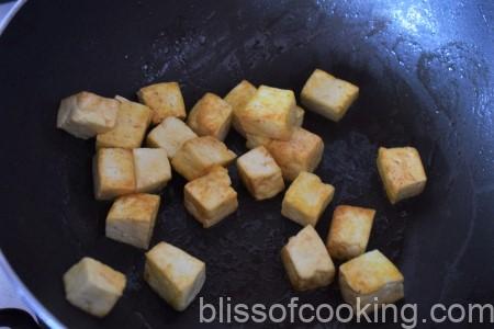 - Heat 2 tablespoon of oil in a pan; shallow fry the tofu lightly and keep aside.