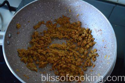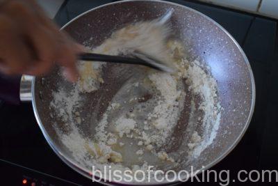 - Add flour and saute till colour changes or for 2 to 3 minute. Switch off the heat.