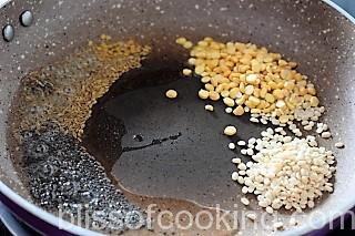 - When the mustard seeds stops popping, add both the dals (pulses), and saute till light brown.