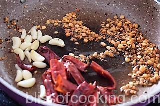 • Heat the oil in a pan, add mustard seeds, cumin seeds, fenugreek seeds and dry red chillies.