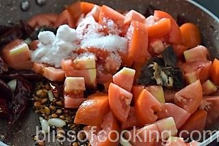 • Add the tomatoes, tamarind, salt and sugar.